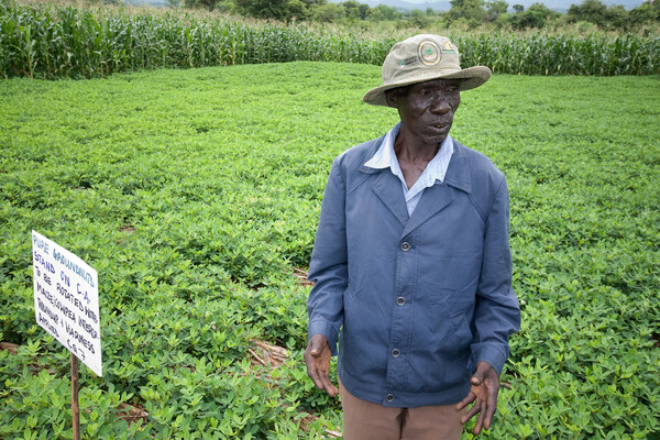 A farmer standing in a plot of groundnuts planted using conservation agriculture (CA) (Photo: CIMMYT).