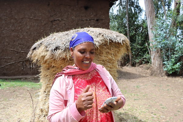 Hawa Abdeal smiles as she reads a climate advisory message, using the information to plan timely actions for her farm. (Photo: CIMMYT)